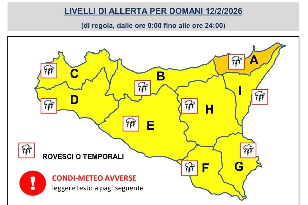 ⏰Il Dipartimento regionale della Protezione civile regionale ha emesso un avviso di allerta meteo GIALLO valido per la giornata del 12 Febbraio. ⚠️ Invitiamo tutta la cittadinanza alla massima prudenza anche in considerazione della possibilità di condizioni meteo avverse, con forti raffiche di vento