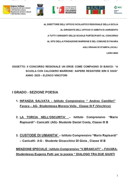 Il CONCORSO REGIONALE UN EROE COME COMPAGNO DI BANCO: "A SCUOLA CON CALOGERO MARRONE: SAPERE RESISTERE IERI E OGGI" ANNO 2025 - ELENCO VINCITORI